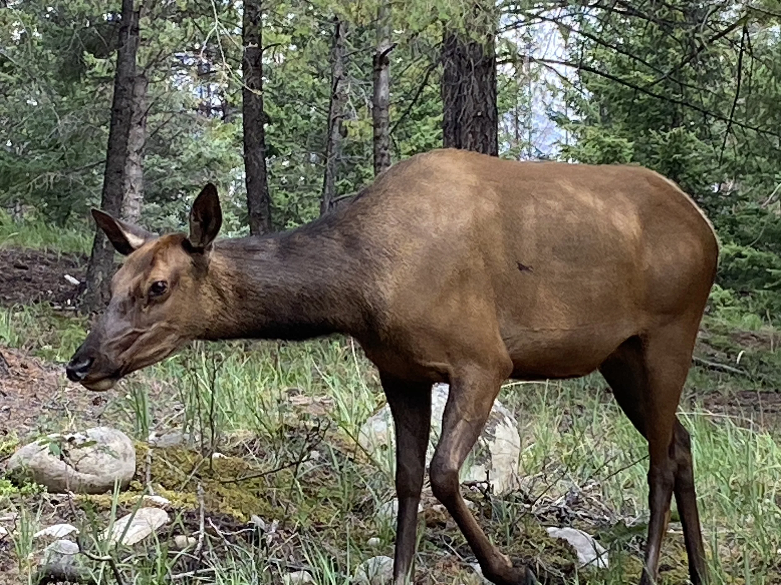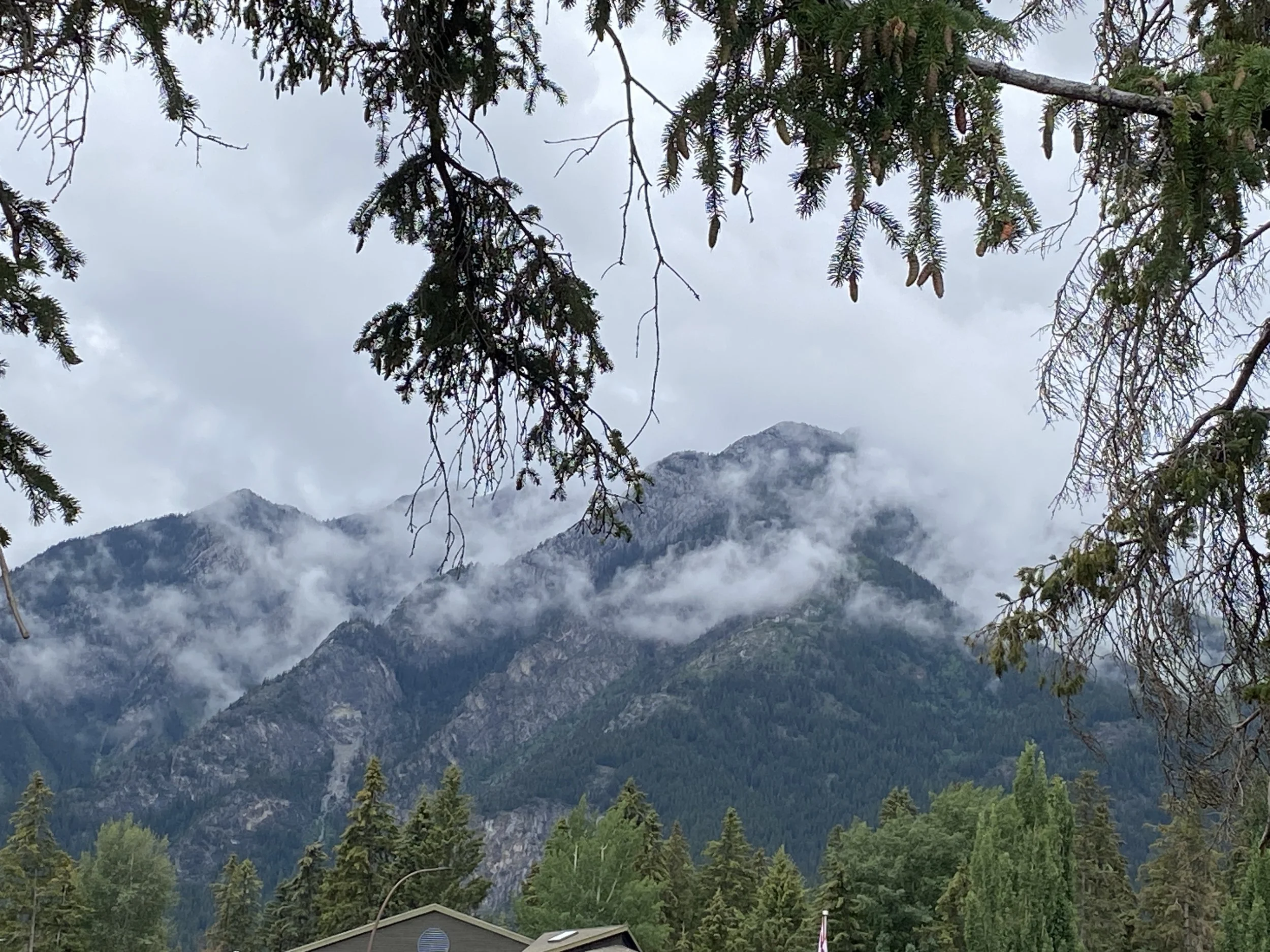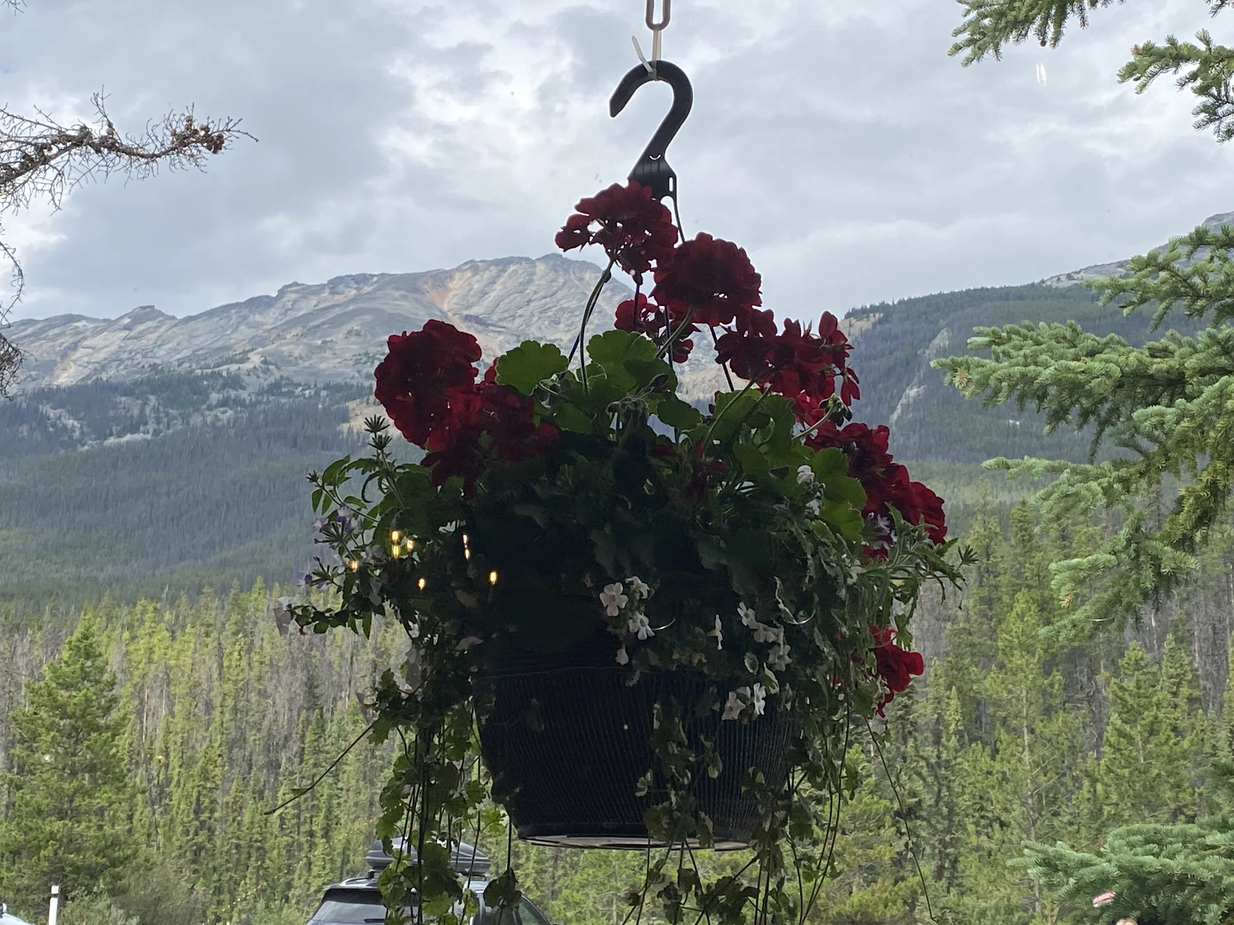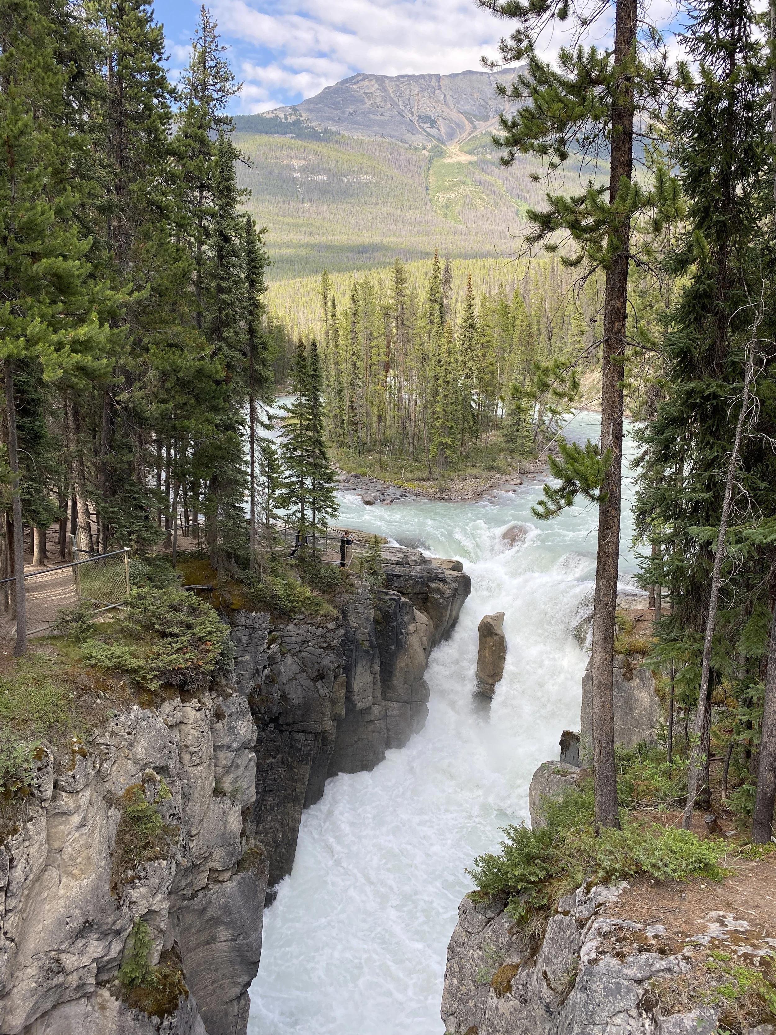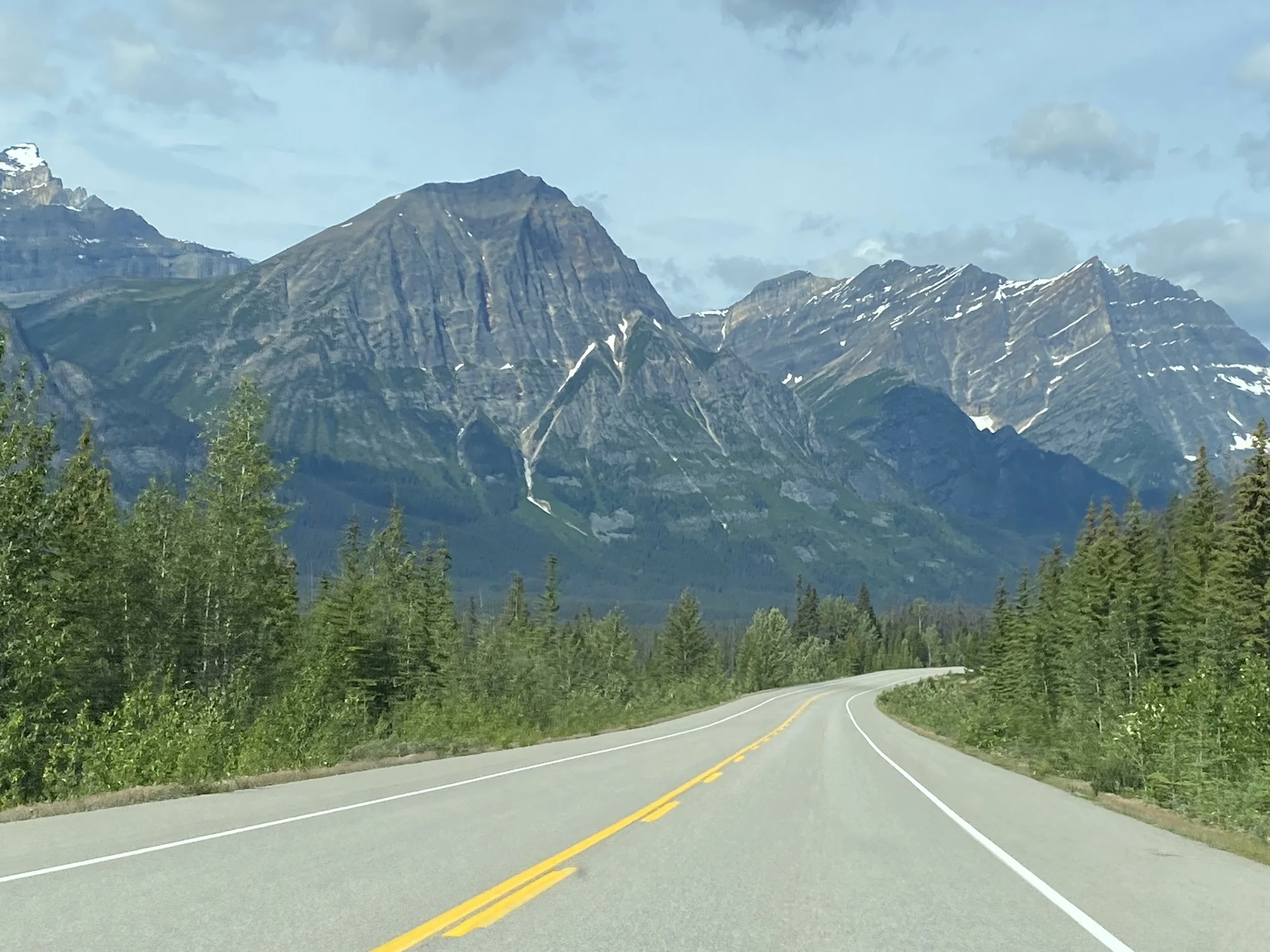 It was raining this morning when we left Calgary, and it rained all the way to Banff. The National Parks of Canada have free admission to the parks this summer so it only cost us the parking for 2 hours in the town of Banff ($14!). We had never been to this iconically Canadian, world-famous park so I just wanted to at least see it and be there for a bit. It had stopped raining for us, praise God, and we walked around the extremely busy streets, catching bits of conversations in a multitude of international languages. We then drove out towards the Icefield Parkway and stopped at a very pretty wayside park to eat some food we had for lunch. Making our way to Sunwapta Falls Rocky Mountain Lodge for the night, I was, like every time I am in the mountains, gawking at every peak and vista we passed, snapping photos left and right. At the Lodge, since the only restaurant within at least 30 miles was in the Lodge, no matter the cost, that’s where we would have to have supper. I chose a bison burger and Norbert had bison meatballs and spaghetti. We then walked to the namesake of the place, Sunwapta Falls and took some cool videos and photos. That’s where Norbert realized that his digestive system thinks bison is pork… hmmm. He’s ok now.