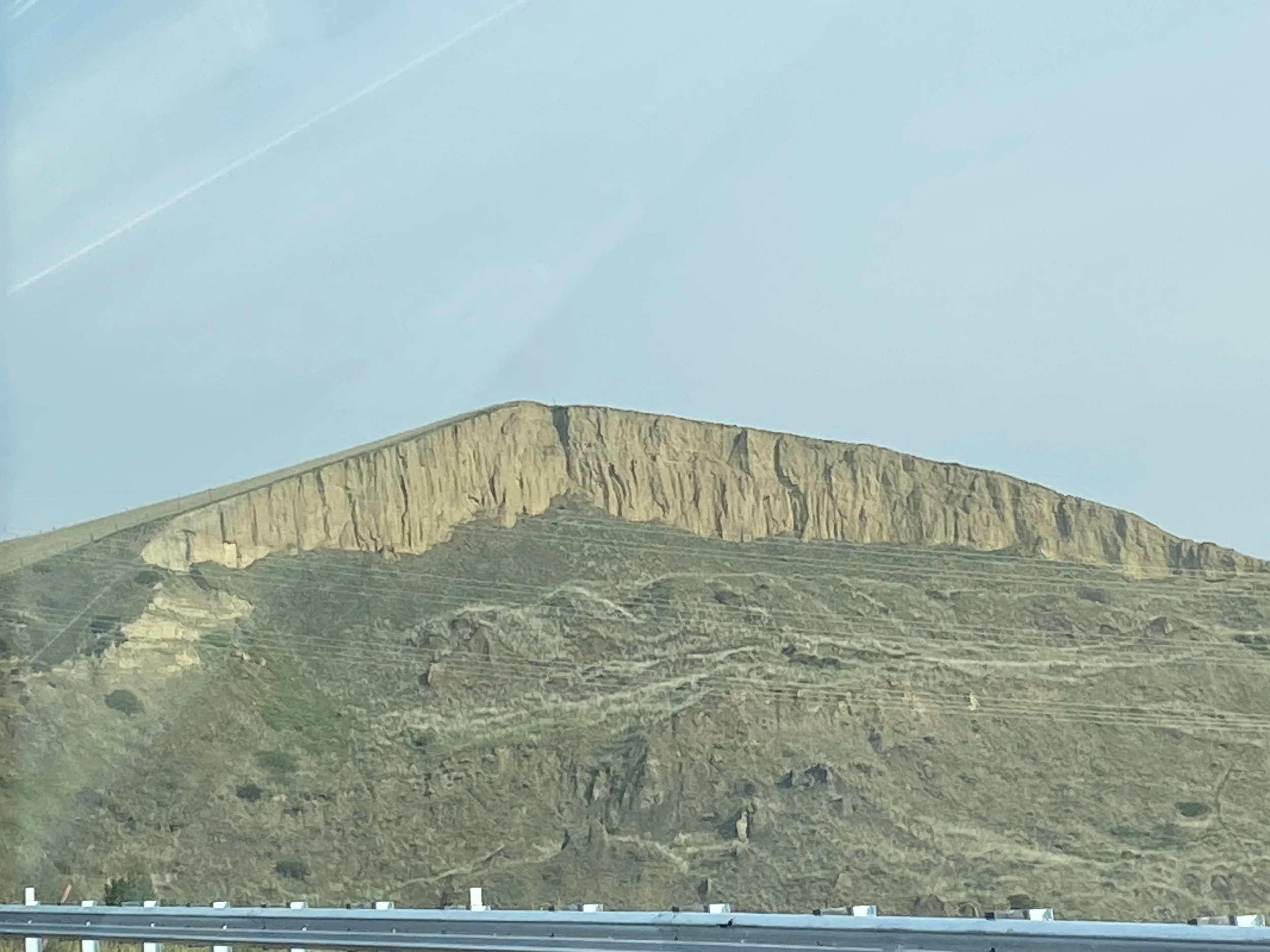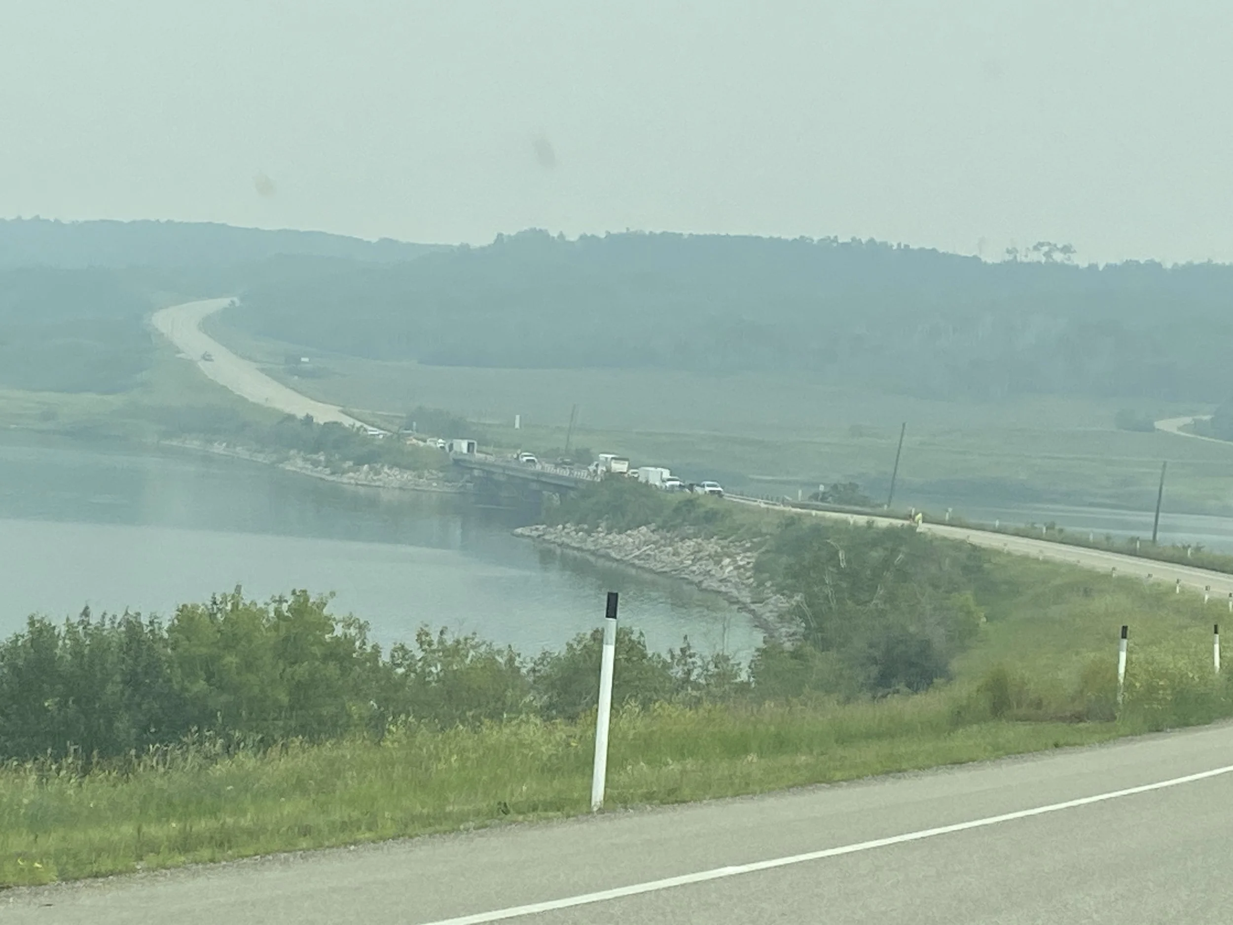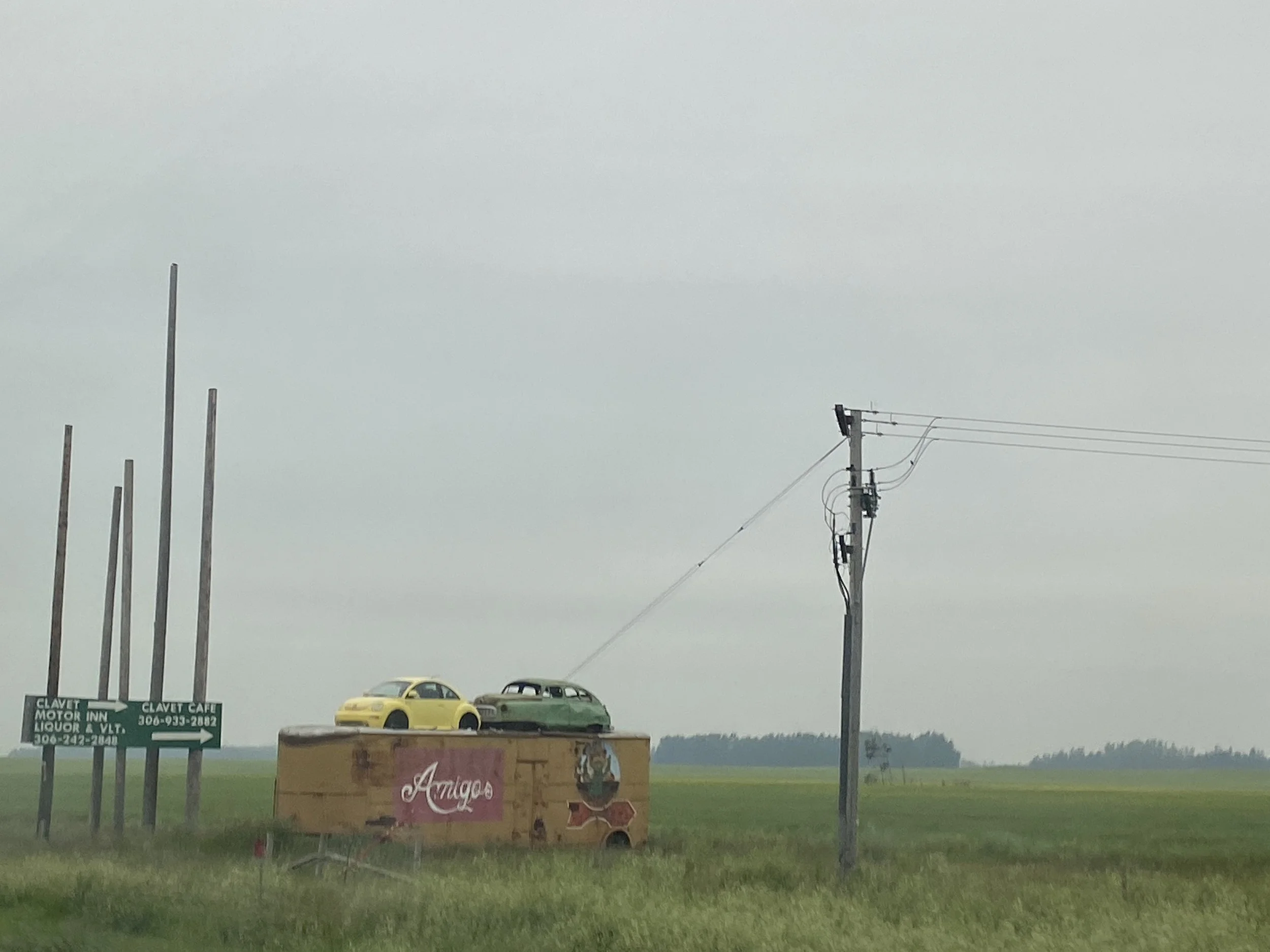 Travelling through these prairies, we saw much of the same landscapes, low rolling hills, some river valleys, lots of fields, some bison pastures, and lots and lots of smoke. I snapped some photos of our Manitoba Mountain sign and view from a distance as well as a couple of odd sights: vehicles on top of things…