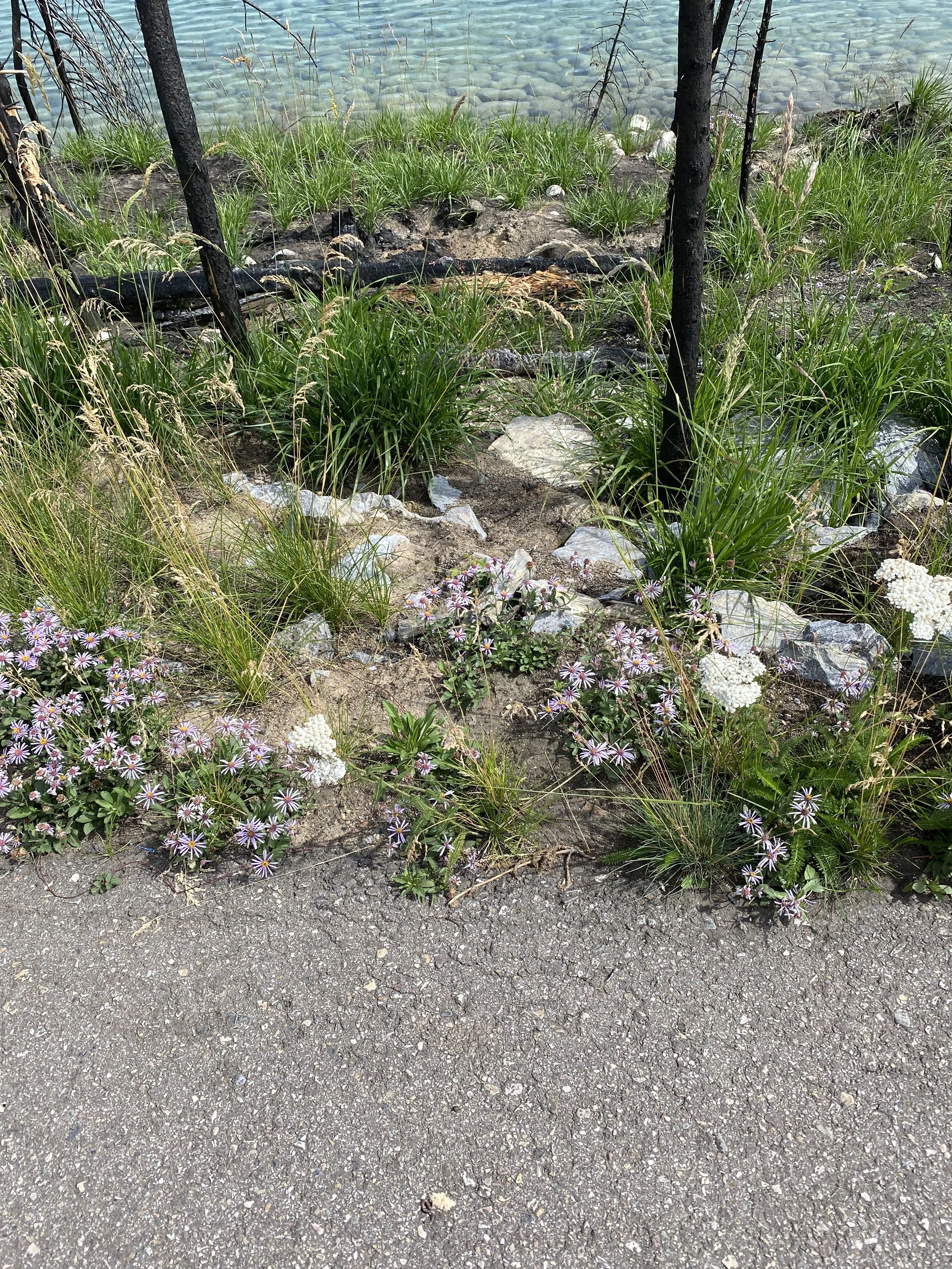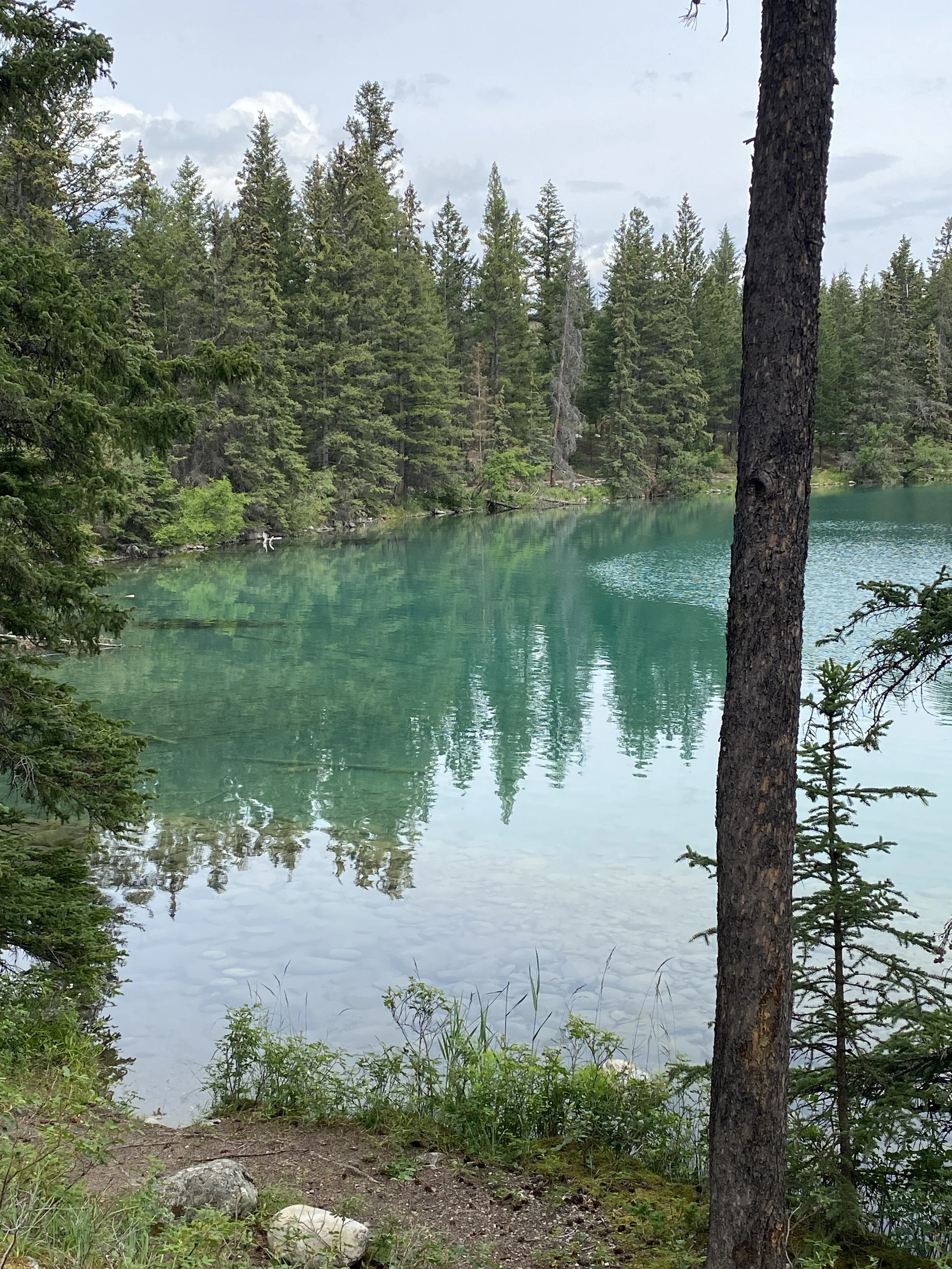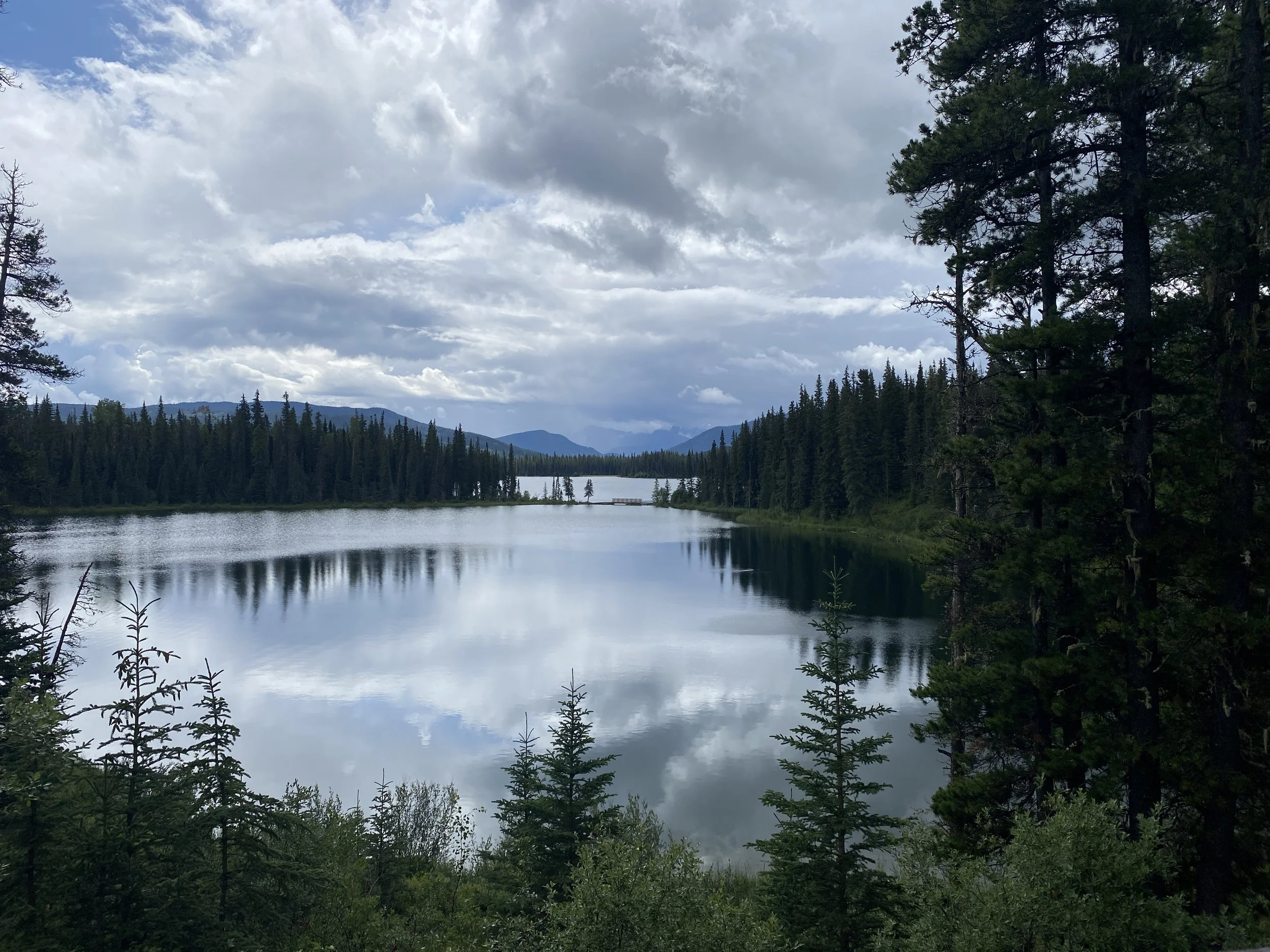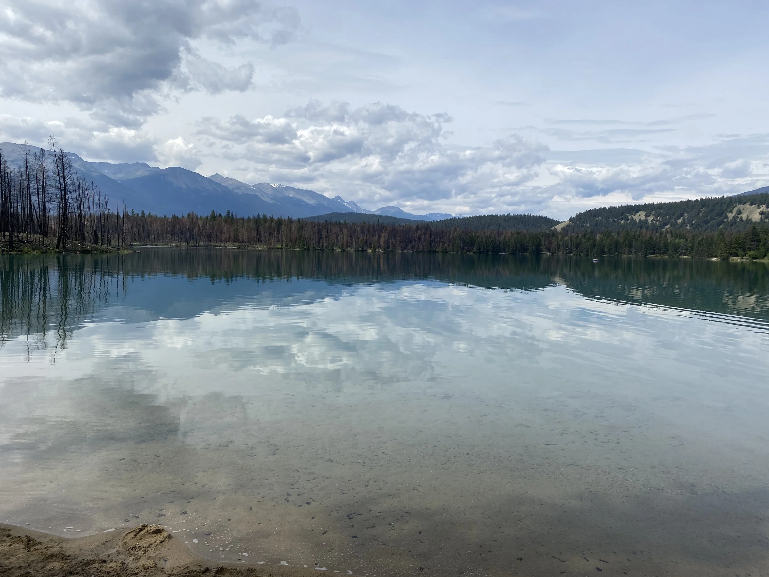 Travelling rest of the Icefields Parkway, we passed many more impressively massive mountains, and then stopped, just outside of Jasper, at a trail for a short hike. I had chosen this hike mostly because it was named for a friend who was to undergo an operation to remove a tumour. She had just discovered this cancerous mass after she admitted to the hospital on the night of the 16th and word was passed along to her friends on the 18th about the discovery. We hiked therefore around Annette Lake, on my part, as a prayer for a successful operation. We witnessed some of the burned forests in which wild flowers were beginning the regrowth process, as well as quite a few elk and an area of quicksand. We did not go through the downtown part of Jasper, where we were told that rebuilding was just beginning. As we arrived in Hinton, I took a photo of the impressive cloud. We stayed at Norbert’s cousin and wife’s home in Hinton, Alberta. What a wonderful, lovely couple. They were very gracious hosts. We went hiking many places, having a picnic on Jarvis Lake. I did an experiment at Jarvis Lake. I thought that the colours in the photos I was taking, especially of the water and sky, seemed washed out, or paler, than what I was seeing. I then realized that I was always wearing sunglasses and seeing these vistas through them. My experiment was to test that theory and it was confirmed. See if you can see the difference in the two ‘identical’ photos below - one was taken through my sunglasses’ lens.