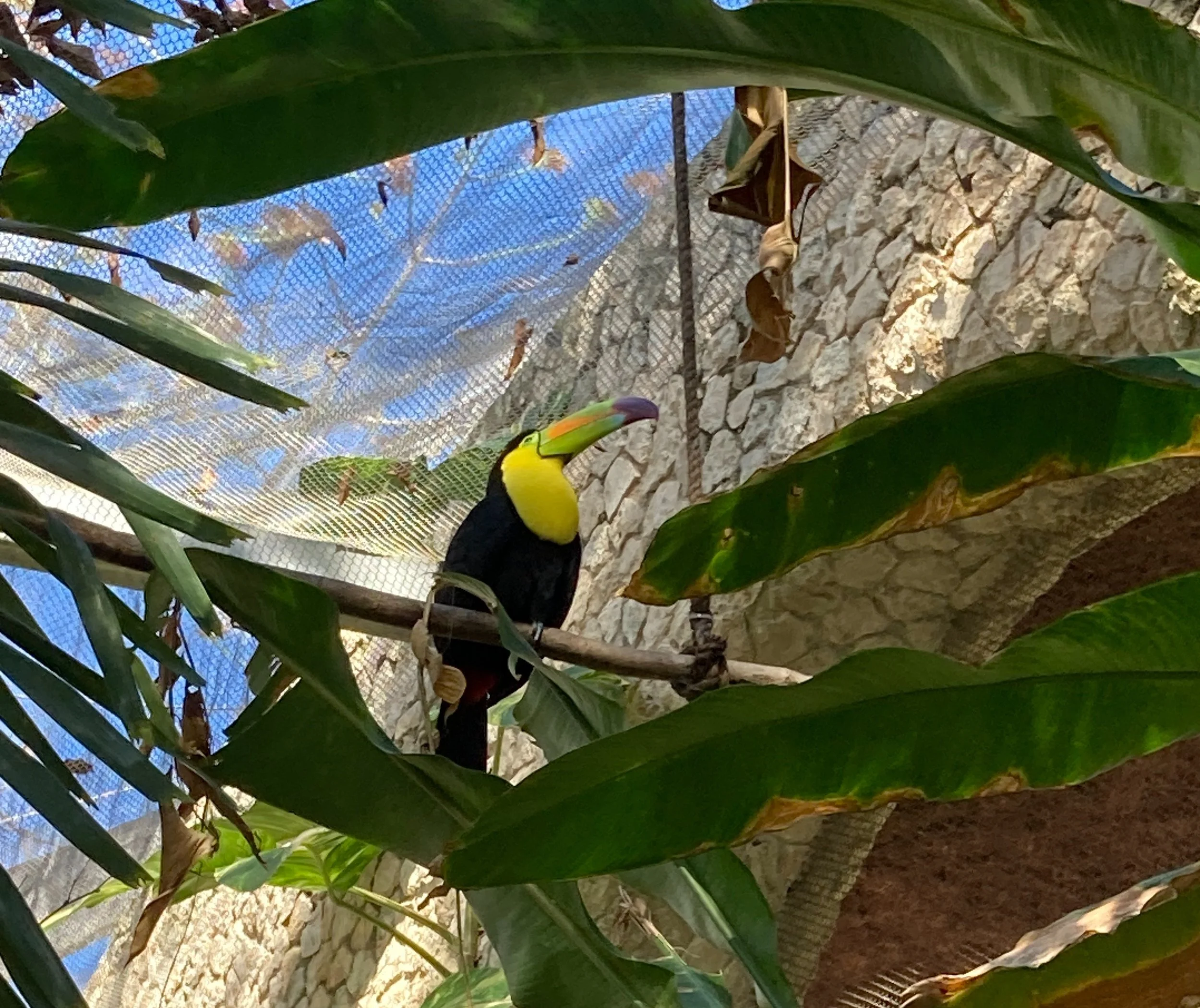 A 15 minute cab ride from our building brought us to the park. We went down an underwater river through gorges and caves. We had life jackets but opted out of swim fins. We should have maybe got them because the river wasn’t really flowing and we had to swim along. I could not reach the bottom most places but the crystal clear, salt water was a perfect temperature. It felt glorious. That took about 45 minutes. Norbert and I then went to the snorkeling cove. They give you a full face snorkel to use and, because it was only about 4 feet deep, there was no need for lifejackets nor swim fins. The snorkel cove was pretty small with lots of people so most of the poor fish must have been hiding. We only lasted a few minutes each then joined Norbert’s brother and wife on the beach under the shade of a palapa. The lunch buffet was absolutely delicious! It came with a free cervesa (beer) and of course, since Norbert doesn’t drink alcohol, I got his as well. We wandered around the park and saw lots of cool things including animals like dolphins, and turtles and birds….(oh my!) The aviary was a beautiful place with about 4 levels and waterfalls with vegetation. There was a big espectacular show at 7 pm and we were so bushed that we found a spot to sit in the venue almost 2 hours early. I thought I would not make it. BUT then there was a pre-show of musicians where 4 people were playing glass bottles for the melody along with the two guitars and a stand-up bass. I got even more energy when they presented an extremely well done done video of the faces and places of Mexico. The actual show was amazing with live musicians and singing, lots of drums and dancing, and images or patterns were projected on the entire floor of the venue. It was finished at 9 pm and we quickly got a cab that brought us back. A great day!